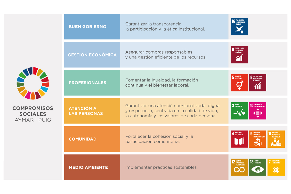 Desde la Fundación Aymar i Puig, somos conscientes de la necesidad de lograr estos objetivos, desde la corresponsabilidad y la implicación hacia nuestra sociedad. Estamos alineados con los objetivos de desarrollo sostenible de las Naciones Unidas dentro de nuestro compromiso fundacional que es conseguir la mejora en la calidad de vida de las personas mayores y de sus familias.